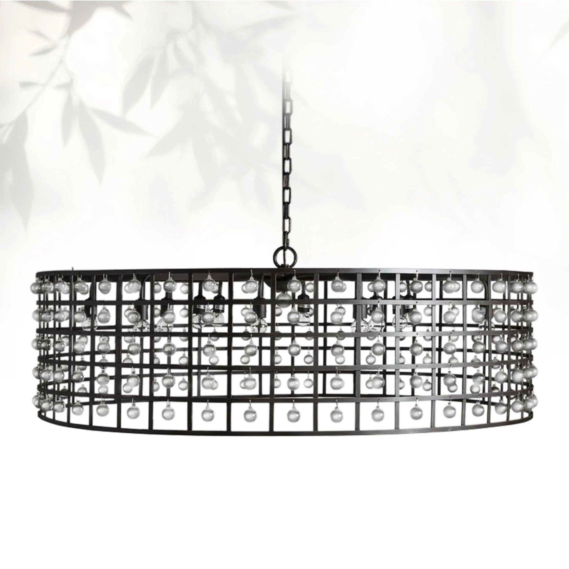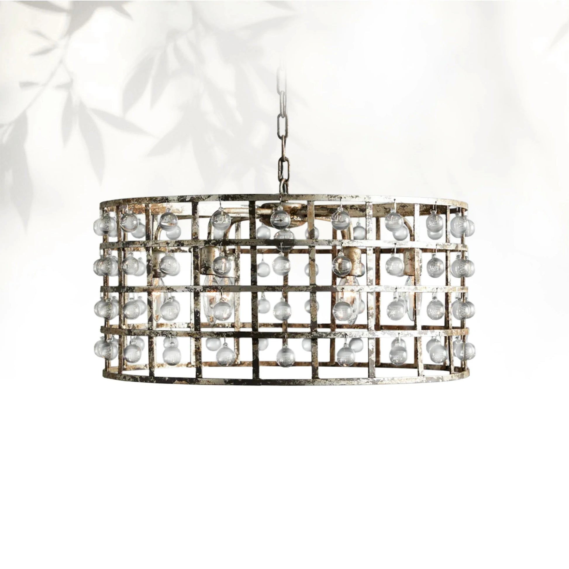 - Iron cage frame features an antiqued metallic finish complemented by Italian crystal spheres.