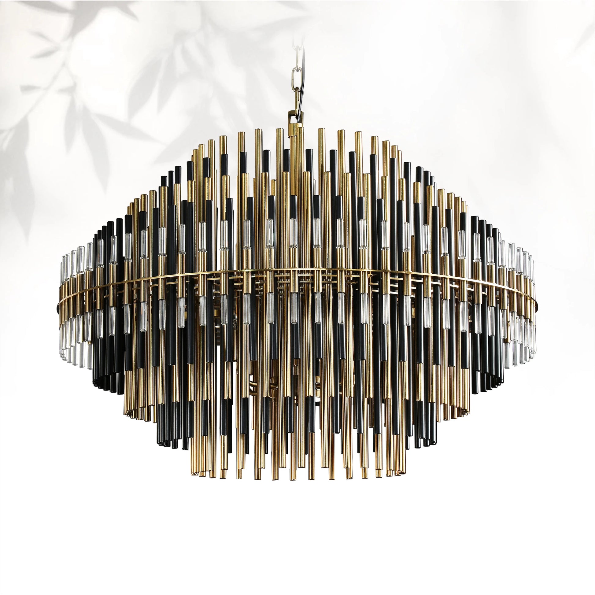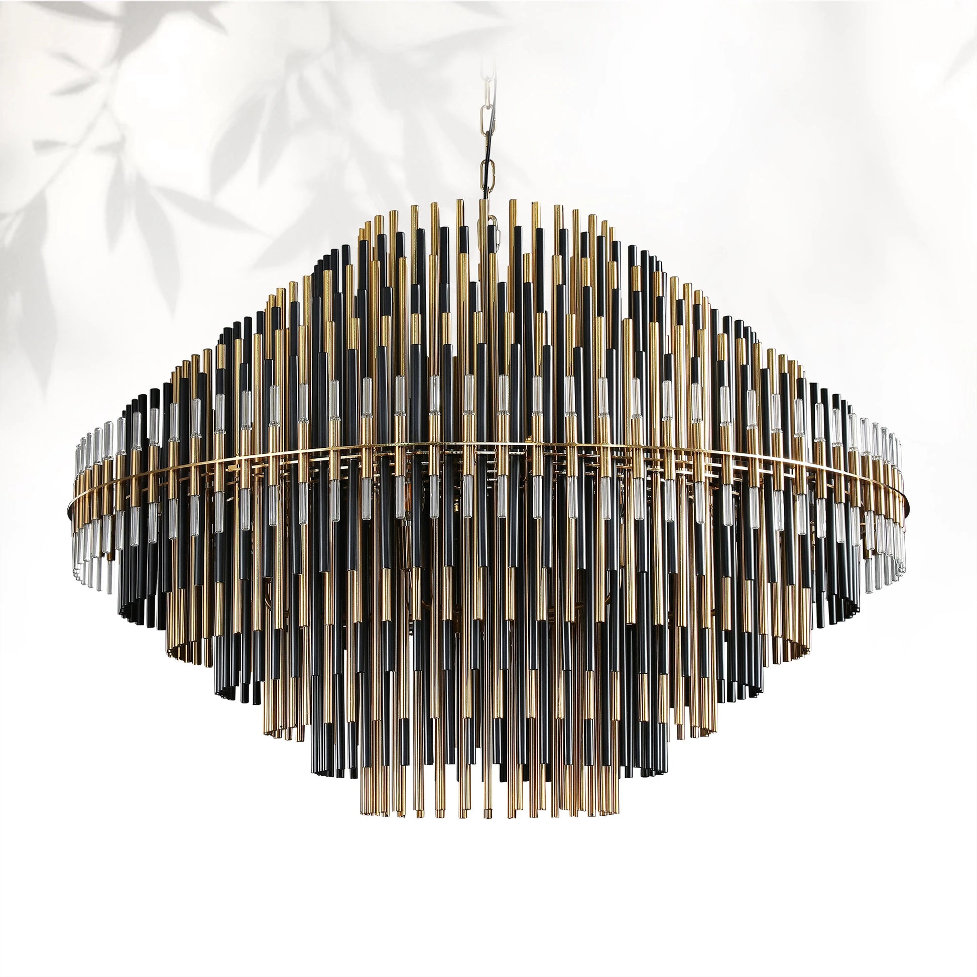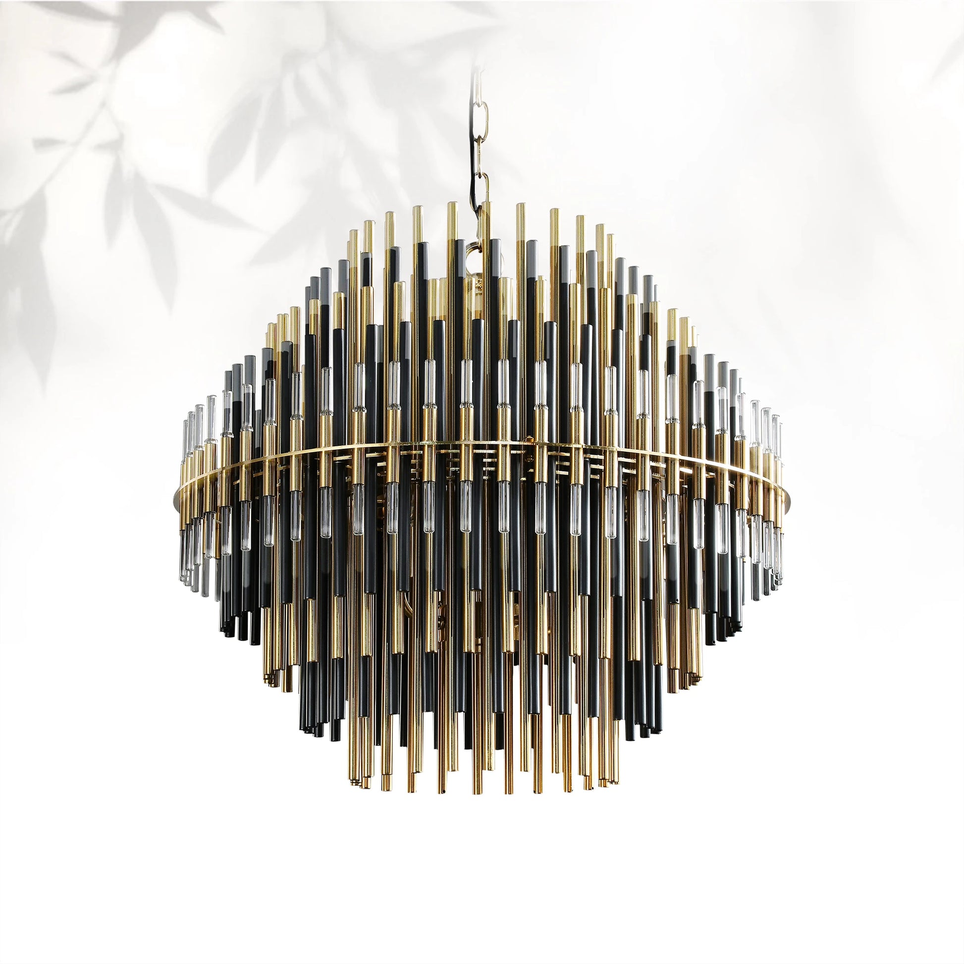 The series of chandelier, designed with rising and falling concentric spikes, forms the silhouette of the sconce, with multiple layers of graduated metal and acrylic rods filtering the light inside, while giving the piece a sculptural presenc