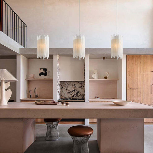 The Gianna Lighting Collection captures the beauty of falling stars with a stunning glow. Featuring thin, adjustable PVC cables, each drop pairs industrial materials with natural selenite stone shades. When illuminated, the drops appear to float in midair, creating a unique, elevated statement in any roomFrame & Shade: Made from PVC cables with a silver finish and clear protective lacquer; pendant shades crafted from natural selenite stone. Each piece varies in color and pattern due to natural materials